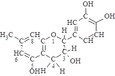 При добавлении ОН-группы в положение 5’ получается галлокатехин. Катехины могут полимеризоваться в дубильные вещества. Кольцо пирана катехинов находится и в лейкоантоцианах, которые являются промежуточными соединениями между дубильными веществами и флавоноидами. Лейкоцианы могут иметь в своем составе остаток сахара (в положении 3, связанный с группой ОН). Ниже приводится структура лейкоцианов.