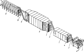 Рисунок 11 - Автоматизированная поточная линия Б6-ЛМВ для производства длинных макаронных изделий Схема производства длинных изделий на автоматизированных поточных линиях с предварительной сушкой на рамках и окончательной сушкой в цилиндрических кассетах. По этой схеме изготавливают длинные макаронные изделия на автоматизированных поточных линиях французской фирмы "Бассано". В нашей стране работают две такие линии. Линия включает в себя макаронный пресс, расстилочную машину, предварительную и окончательную сушилки, стабилизатор-накопитель и группу упаковочных машин. Основные преимущества этой схемы - отсутствие сухих отходов и получение абсолютно прямых изделий одинаковой длины. Достигается это тем, что разрезанные на отрезки одинаковой длины макаронные изделия после предварительной сушки на рамках проходят окончательную сушку внутри вращающихся цилиндрических кассет. Таким образом, изделия высушиваются в процессе непрерывного перекатывания по внутренней поверхности цилиндрических кассет, что делает их абсолютно прямыми. Схема производства короткорезанных изделий на комплекс на механизированных поточных линиях. Линия (рис.10) состоит из двух основных элементов: шнекового макаронного пресса 1 и сушилки непрерывного действия 2. Выпрессовываемые изделия непрерывно нарезаются каким-либо механизмом для резки коротких изделий и подаются на верхнюю ленту паровой конвейерной сушилки. Постепенно пересыпаясь с верхней ленты на нижележащую, изделия обдуваются нагретым сушильным воздухом.