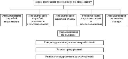Рисунок 8 - Организация по товарному принципу Преимущества этой организационной структуры в том, что управляющие по товару, в том числе по второстепенным товарам, координируют весь комплекс маркетинга по своему товару, быстро реагируют на возникающие на рынке проблемы, и это хорошая школа для молодых руководителей. Недостатки в том, что часто возникают конфликты из-за недостаточности прав у управляющих по товарам и система обходится дороже, чем предполагается вначале. Суть организационной структуры по рыночному типу в том, что вместо товара, управление организовано по рынкам сбыта (отраслям), как показано на рис. 9. Достоинство этой системы в ориентации фирмы на нужды потребителей, составляющих конкретные сегменты рынка. Организация по товарно-рыночному типу или матричному принципу представлена на рис. 10. Система обладает преимуществами товарной и рыночной структур, однако основными ее недостатками являются большие затраты и частые конфликты. Однако большинство управляющих считают, что достоинства матричной системы перевешивают ее недостатки.