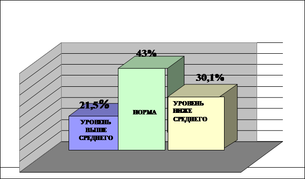 Рис. 1. Результаты исследования долговременной памяти учащихся 2 "А" класса На рис. 1 видно, что количество учащихся 2 «А» класса, имеющих уровень развития долговременной памяти выше среднего - составляет 21, 5% от общего количества учащихся класса. Количество учащихся, имеющих уровень развития долговременной памяти в пределах нормы – 43% от общего количества учащихся класса. Количество учащихся, имеющих уровень развития долговременной памяти ниже нормы – 30, 1% от общего количества учащихся класса. На рис. 2 представлены результаты исследования кратковременной памяти учащихся 2 «А» класса.