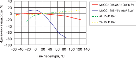Теперь несколько слов о грустном. При всех своих достоинствах, керамические конденсаторы большой ёмкости производятся с использованием диэлектриков типа X7R/X5R и Y5V. Их отличительной особенностью является сильная зависимость диэлектрической проницаемости, а с ней, согласно (1), и ёмкости от температуры и приложенного напряжения. Типичные зависимости такого рода для конденсаторов разных типов показаны ниже на двух рисунках. Температурная зависимость ёмкости конденсаторов